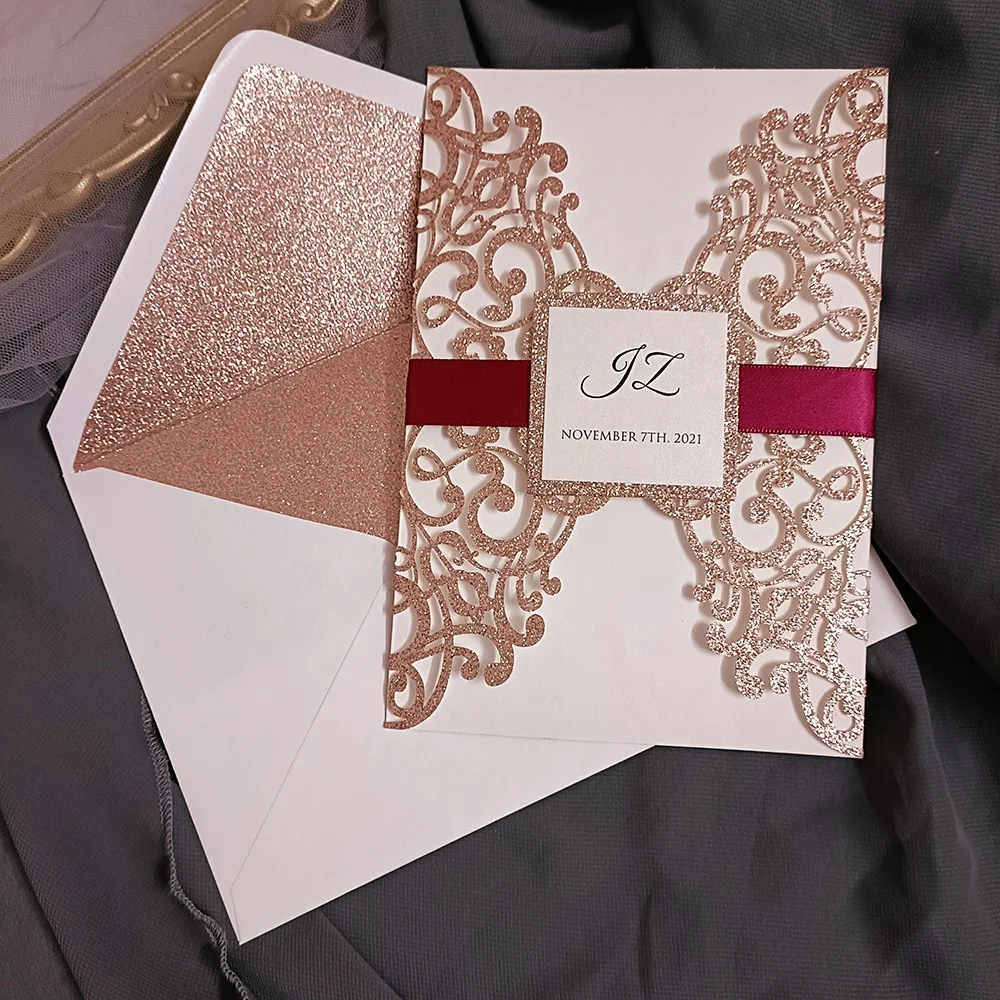 Pink Gold Glitter Laser Cut Wedding Invitation Cover With Perosonalized Print Insert And Ivory Matt Envelope With Glitter Lined Buy Luxurious Wedding Invitation Card Invitation Card With Glitter Paper Invitation Card Design Product